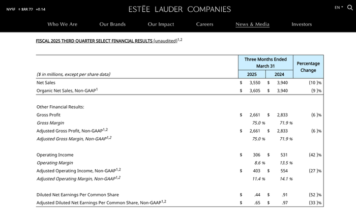 然而深入分析这些国际巨头的业绩表现却不容乐观:欧莱雅2024年北亚区销售额同比下降3.2%至103亿欧元,这是其中国区14年来首次下滑,2025年一季度有所复苏,销售额同比增长8.4%;雅诗兰黛2025财年第三季度(2025年1月1日-2025年3月31日)销售额同比下滑10%,营业利润下降42%至3.06亿美元,利润率从上年同期的13.5%降至8.6%。