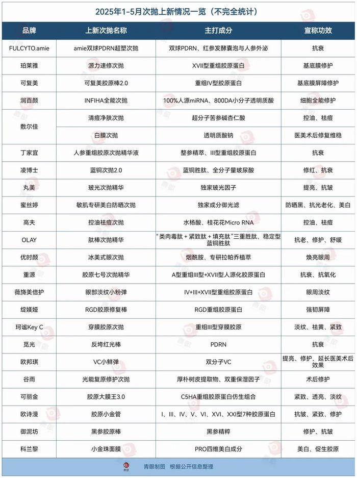 此外,青眼不完全统计2025年1-5月次抛产品上新数量发现,在24款上新的次抛产品中,共有21款次抛精华,占比超87%。这反映出,次抛精华正成为化妆品市场的“当红炸子鸡”。